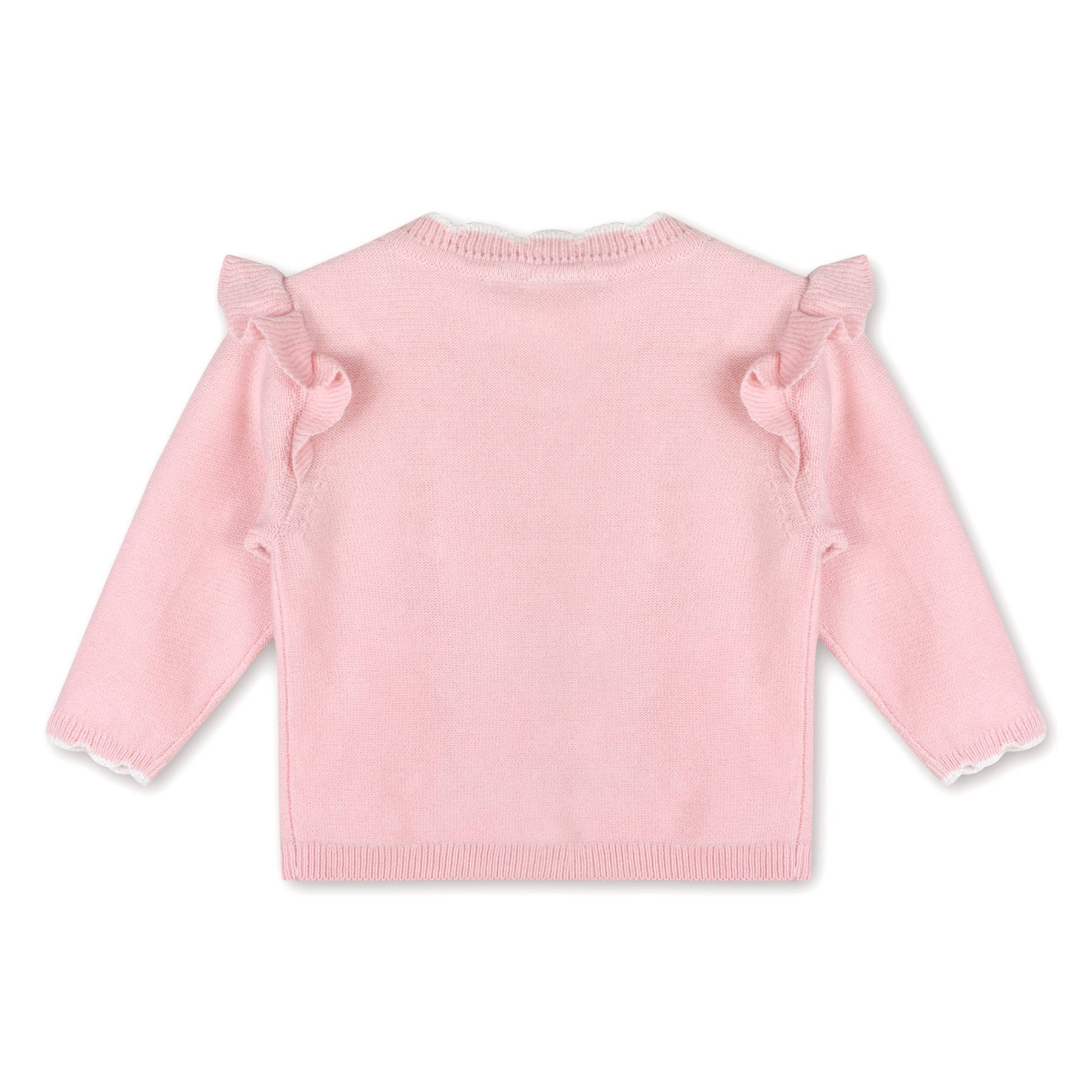 00% organic cotton baby sweater featuring floral bouquet embroidery and a delicate pointelle knit.
