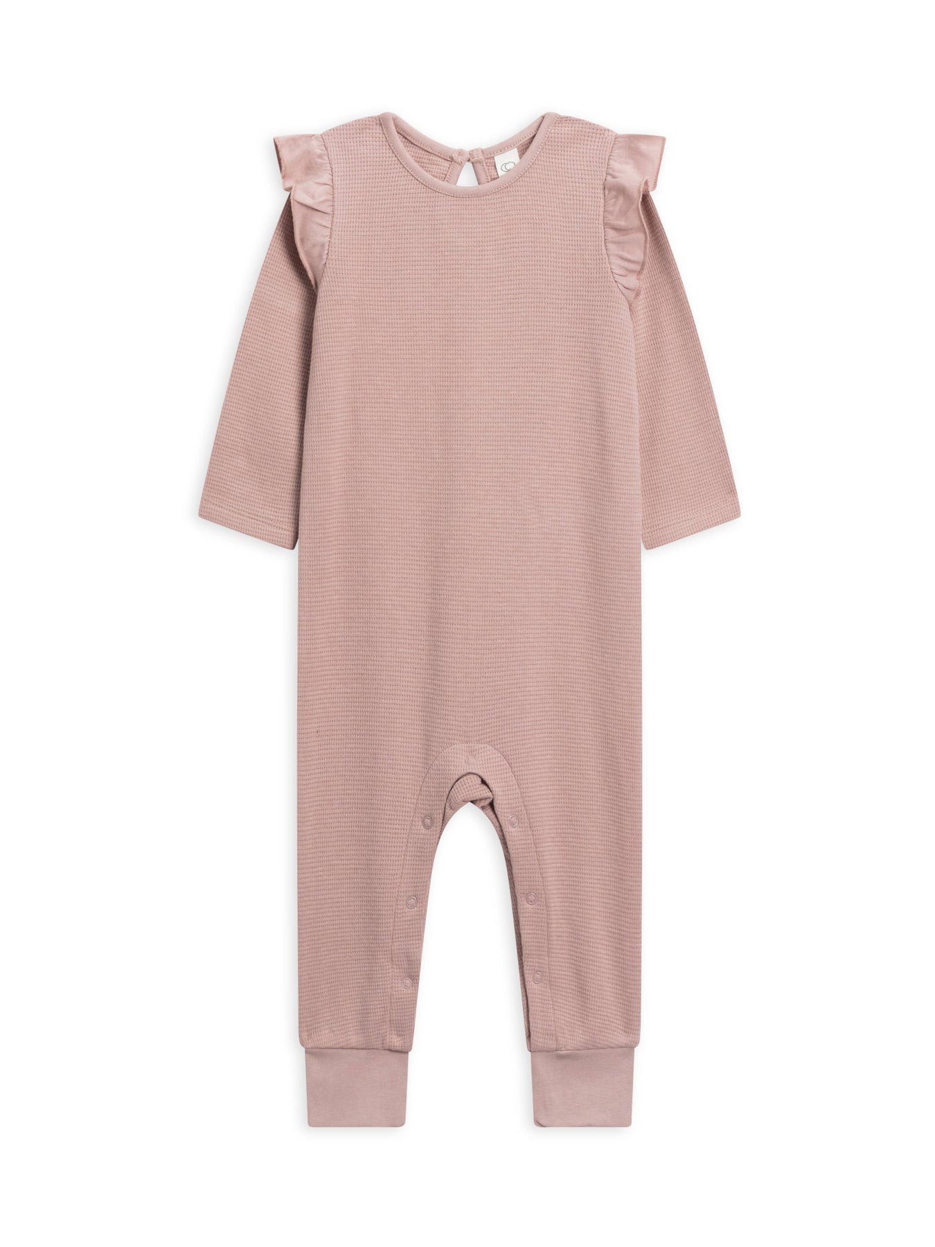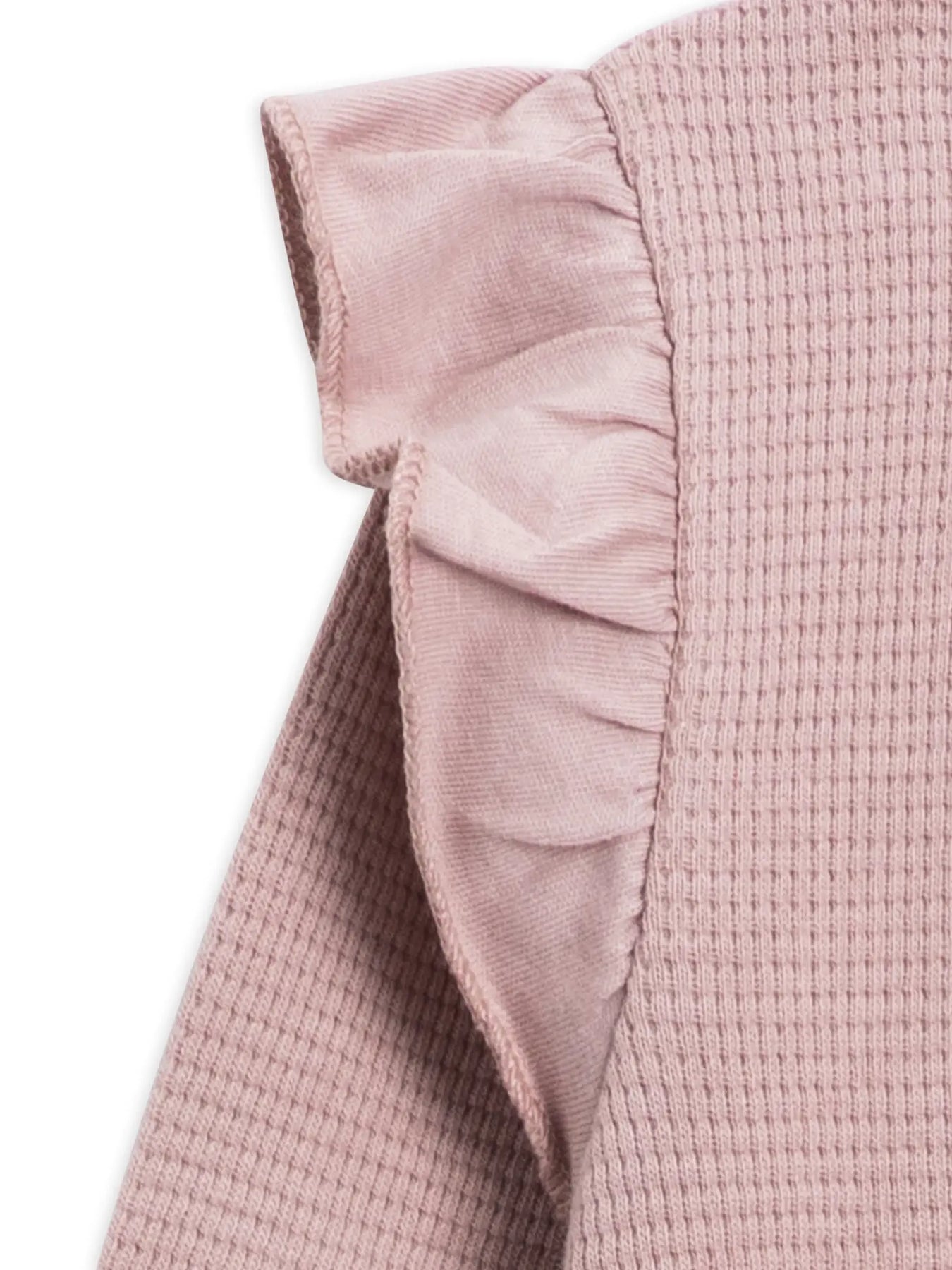 The Mila Waffle Knit Flutter Sleeve Romper is truly the best of both worlds when it comes to style and comfort. Made from the coziest waffle knit fabric with a sweet flutter sleeve detail on the shoulder, you'll love dressing your baby in this adorable piece all winter. It has leg and gusset snaps and a coconut button neck closure on the back for easy dressing and diaper changes.